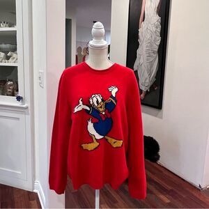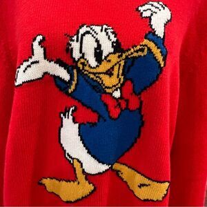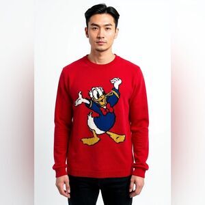 Bold red sweater featuring a lively Donald Duck graphic. Adds character to any outfit.
