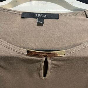 Elevate your wardrobe with this elegant tan top from Gucci. Perfect for any occasion, this top combines style and comfort effortlessly. In good preowned condition. only flaws i see is some small scratches on the metal plate. otherwise very good condition.Feel Free to make an offer!