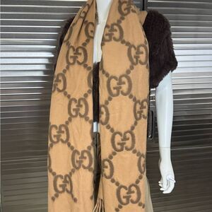 Large wool scarf with jumbo Gg and fringe. This is super soft and luxurious. No holes or stains. Gucci label is intact but material label is missing.