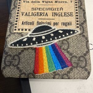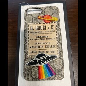 This is an authentic GG Supreme Monogram Courrier iPhone 8 Plus Case. This stylish case is crafted brown on beige Gucci monogram with spaceship with rainbow and planet patches. This phone case features a brown microfiber interior that fits your iPhone 8 plus
