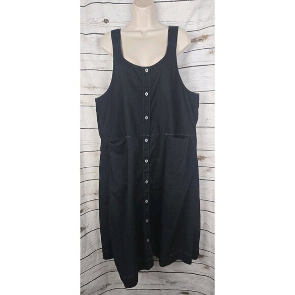 Black dress with button front and overall straps. Sleeveless style. Perfect for versatile wear!
