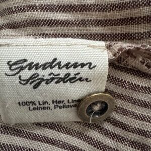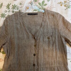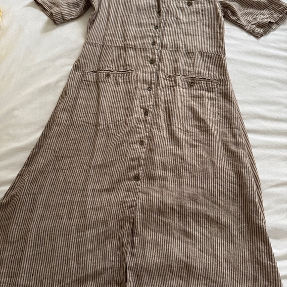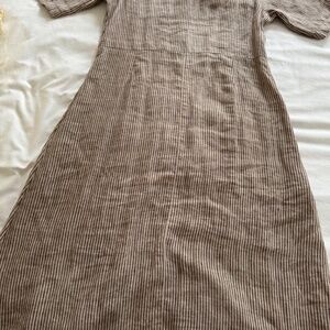 Beautiful linen, brown and natural striped, loose fitting, can be layered, worn only once but runs large so too big for me.