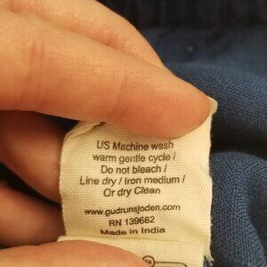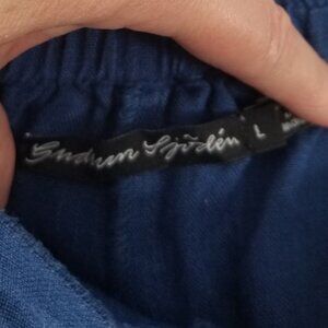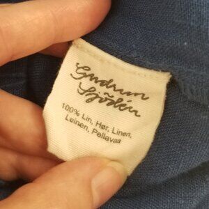 These are a perfect weight linen, not too light and not too heavy, a perfect medium weight for many seasons and a lot of versatility. The fabric is soft and very comfortable, and the cut is a relaxed fit. The blue is in the range between a royal blue and navy. There is an elasticized waist for easy wear and placement on waistline (these are more of a high-rise waist). This garment is a part of my own closet, and I've only worn them once or twice while trying to incorporate more blue this shade into my wardrobe. As I am currently downsizing for an eventual move, I'm willing to pass these on to someone who loves a relaxed wide length pant in linen and who loves this shade of blue. Materials and care instructions are pictured.