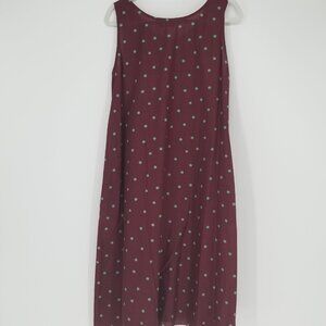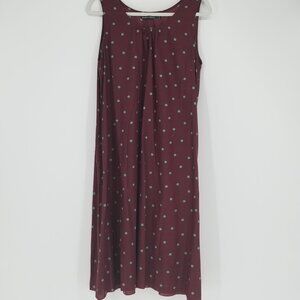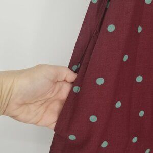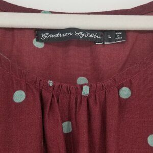 This is an adorable dress with perfect hues for the fall and winter. This is a cotton dress that is light to wear in aubergine w/ polka dots in a Gudrun Sjoden staple color, artemisia, a type of blue/green jade hue. It is perfect to wear with a turtleneck and long skirt, pants, cardigan, the layering possibilities are endless in a rich aubergine shade. This is from my closet and has been gently worn; I purchased from Gudrun Sjoden in season and not from a discounter. I am currently working on downsizing, and I think a fellow posher will enjoy it. The garment is in excellent condition, and it has side pockets. The fit around the bust is a little smaller than some Gudrun garments. Please see the pit2pit measurements to ensure there is enough give for your bust size. I recommend this fit for those who wear a Medium to Large size (about size 12 here) with a bust size of 38" or smaller for the most comfortable fit and ability to layer with a top under if desired. Looks cute with a blouse with tie, tights, and heeled loafers (a retro preppy type piece) with a blazer and beret, as a lagenlook piece, or a dress over jeans. Enjoy styling possibilities!
