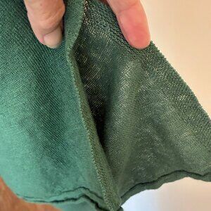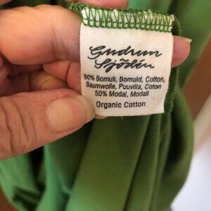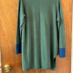 New with tags, Gudrun Sjoden Long Sleeve Linen tunic in sea green with blue colored cuffs, V neck and side slits. The tunic is a light weight knit material.