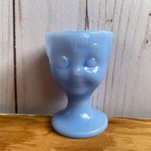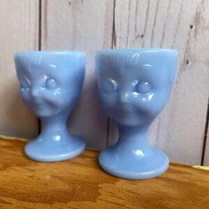 Set of two brand new Guernsey Glass Delphite blue glass egg cups. The faces are inspired by Hummel. These are in mint condition, never used, off-the-shelf vintage discontinued deadstock. Marked inside the cups with a raised B for Guernsey Glass, out of Ohio. Measure approx 2 1/2" H.
