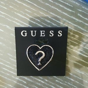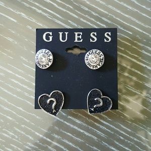 First pair of earings resemle a pants button and has "guess jeans est. 1981" written across. the second pair are jet black crystaled hearts & question marks in the middle, identical to the ring. Never been worn. Really cute retro looking