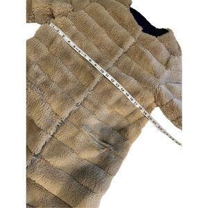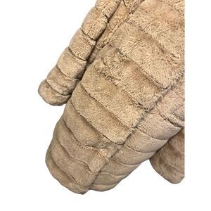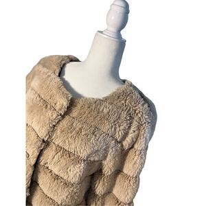 Super comfy tan faux fur 3/4 length coat. Fully lined. Front pockets. Large snap front closures.