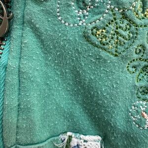 This charming green sweatshirt features delicate lace trim and intricate embroidery on the chest, offering a blend of style and comfort. The full front zipper adds practicality to this beautifully designed top, making it a versatile addition to any wardrobe.