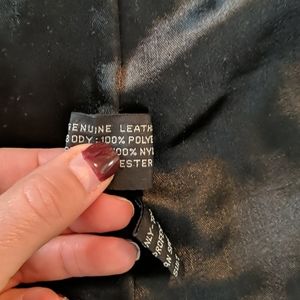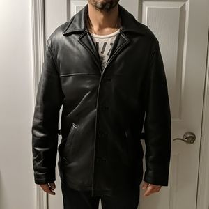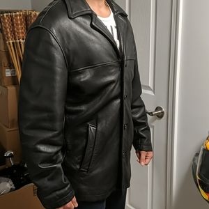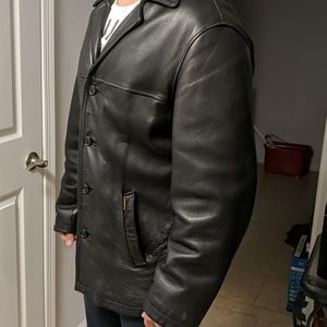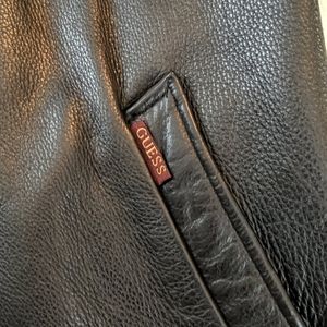 Mens Guess lined leather jacket. Heavy for the winter. Great condition. Has one scratch mark on left shoulder towards the back. Button closure down the front. Side pockets. Adjustable straps on the sides. Pockets on both sides, inside the jacket. Perfect for the winter!!