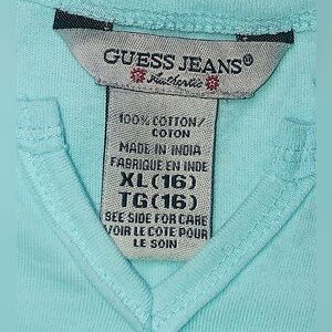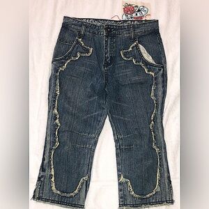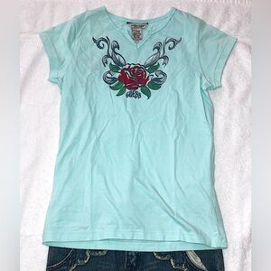 Color: Aqua Blue T-Shirt With A Small V-Neck & Red Rose On It & Denim Blue Jean Capris With A Rose Design On The Half Folded Back Pocket.