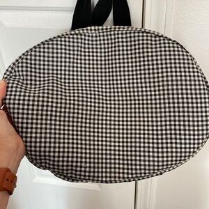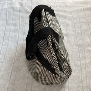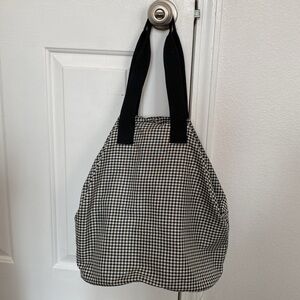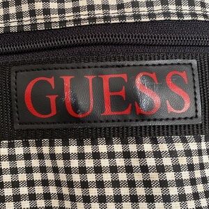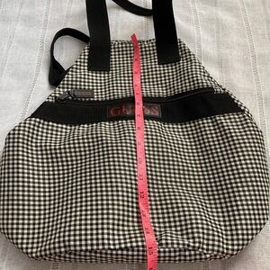 Guess 90s gingham tote bag. Rare find! Black and white gingham with signature Guess lane on front. Unique zipper and button clasp - looks almost like a small duffel when handles are pulled apart. Lightly preloved with some wear on the Guess label. Interior is similar to that of a reusable bag. A great tote for school, work or travel. Will hold a lot!