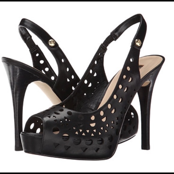 Peep toe sling back platform heels with etched design on the leather upper. MSRP: $99