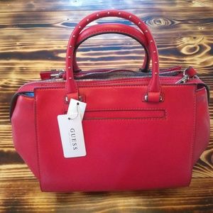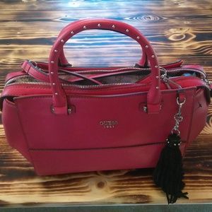 This red pebbled faux-leather satchel features a front logo, studded hand strap, removable tassel keychain and top zipper closure for a feminine look. Interior pockets.