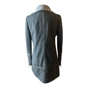 Guess, coat, jacket, winter coat, wool blend, colorblock, two-tone, gray, black, asymmetrical zip, moto jacket, biker jacket, edgy, punk, faux leather, knit collar, stylish, warm, winter, fall, outerwear, small, petite.