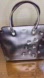 NWOT Guess Bobbi 3D Floral handbag. Faux Saffiano Leather exterior with a rich high metallic pewter finish. Stud and flower embellishment on front. Chrome/silver hardware throughout. Still has protective film on strap hardware mounts. Top zip, with outer zip slip pocket. Logo interior has open slip pockets on one side and a single zippered slip pocket on the other. Bag has not been used but does have some very minor scuffs from storage as shown. Measures approximately 12”x10”x5-1/2”, with a 6” handle drop.