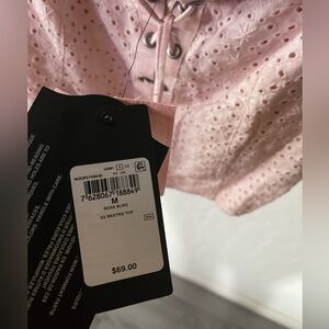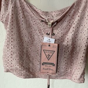 Women’s GUESS pink eyelet crop top in spring style with puffed sleeve, size medium.