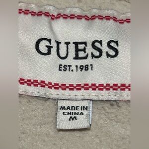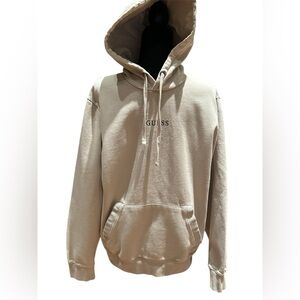 Guess hoodie, beige fleece sweatshirt, Guess logo hoodie, men’s pullover hoodie, neutral loungewear top, Guess embroidered sweatshirt, cozy cotton fleece, classic Guess style, streetwear hoodie men’s medium, minimalist beige hoodie, soft fleece pullover, Guess casual wear