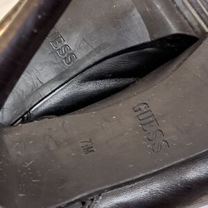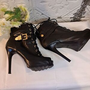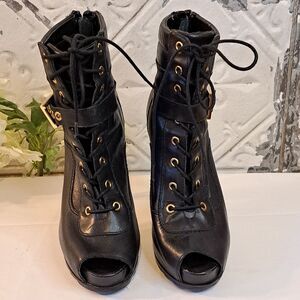 Guess Bieninda Black Leather Peep Toe High Heel Boots Buckle Details 7.5 M