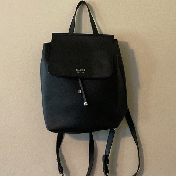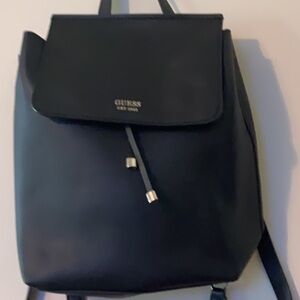 Chic Guess Backpack in black. Features a sleek flap closure and adjustable straps. Ideal for everyday use but classic enough for office Very good condition with zipper pocket on backside. Dimensions 14” x 11” x 4”