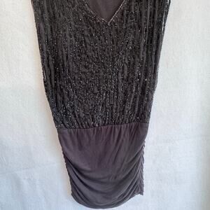 Guess Los Angeles women’s black beaded cocktail dress. Features sleeveless design, V-neckline, fully beaded bodice with shimmering detail, and ruched hemline skirt. Elegant and chic — perfect for parties, holiday events, or evening occasions. Size M.
