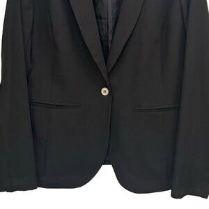 A sleek and versatile black blazer from Guess, designed with a polished single gold button closure, classic lapel, and a flattering tailored fit. Perfect for office wear, job interviews, business meetings, or elevating a casual chic look.