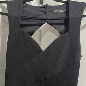 Elegant body-con black dress with a sweetheart neckline and diamond shaped cut out on the backside. Three gold buttons close the back at the neck and zipper up the backside. Ideal for evening occasions. Modern and sophisticated look.