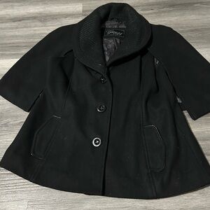 Chic black cape jacket by Guess. Features button closure and stylish collar. Ideal for layering. Condition used