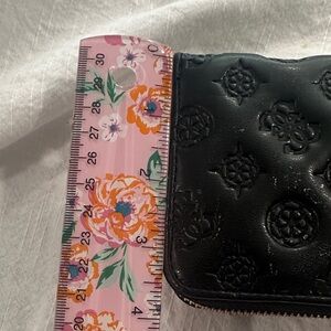 Elegant black wallet by Guess. Embossed pattern with zip closure.