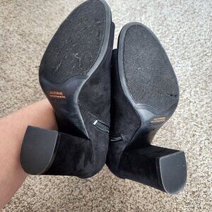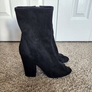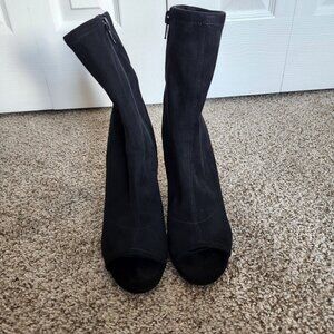 These boots are by Guess. They are black and made of a faux suede material. They have an open toe and shaft height that lands at the calf. They have high block heels and an inner zipper closure. They are in excellent pre-owned condition with no holes, rips or stains. There is a scuff mark to the outer heel on the left boot. Bundle with other items in my closet to get the most out of shipping!