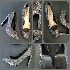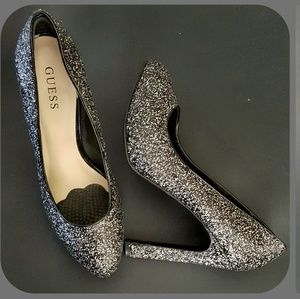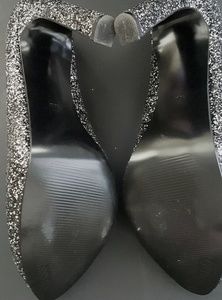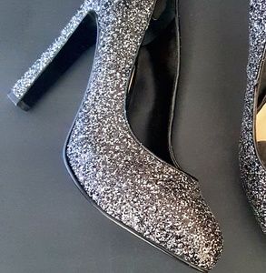 Elegant black glitter heels. Perfect for evening wear. Features a sleek design.