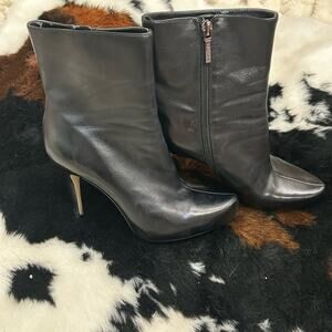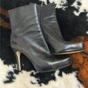 Elevate your style with these sophisticated Guess heeled boots, crafted in a timeless black hue. Featuring a chic ankle height and a sleek silhouette, these boots are perfect for adding a touch of elegance to any outfit. The refined design ensures both comfort and a modern aesthetic, making them a versatile addition to your wardrobe. The interior of the boots show some wear (pictured) and the exterior of the boots show little to no wear (pictured). These boots are a great designer dupe.