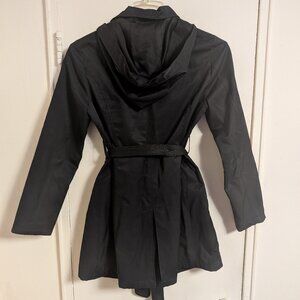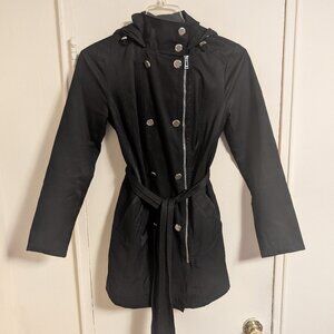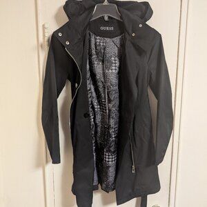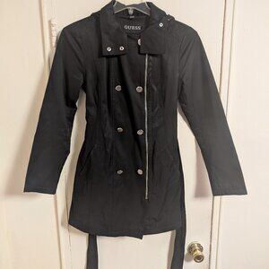 This is a beautiful black double breasted hooded trench coat from Guess in Medium. The belt can be used to shape the waist and give an hourglass silhouette. EUC (Excellent Used Condition).