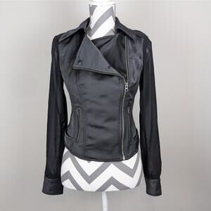 Guess Black Satin Look Moto Jacket with Sheer Sleeves