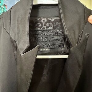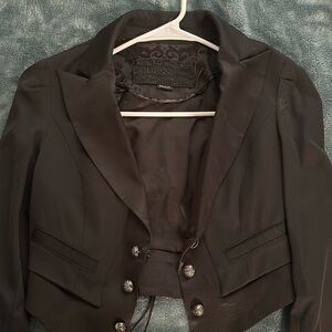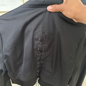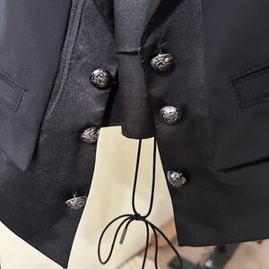 Stylish black crop jacket with intricate detailing. Ideal for sophisticated looks.