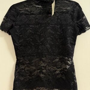 Chic black lace blouse. Short sleeves with intricate floral pattern. Perfect for elegant occasions. See through on top and very bottom with black blocking in the middle. Brand new never worn. Guess designer brand.
