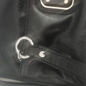 Elegant black wristlet with silver clasp. Features Guess logo plate. Perfect for evening outings.