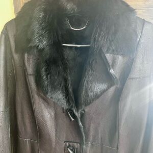 Elegant black leather genuine rabbit fur coat. Features fur collar and toggle buttons. Sleek and stylish design. Side pockets. Made out of patchwork leather . Gently used