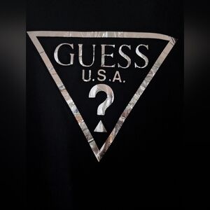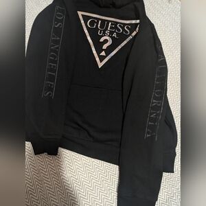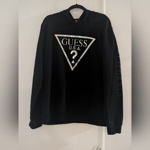 Classic black hoodie with iconic Guess logo. Comfortable and stylish for everyday wear.