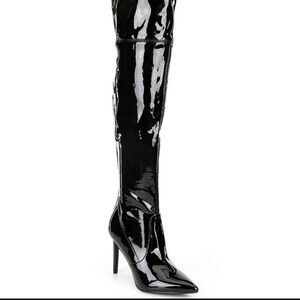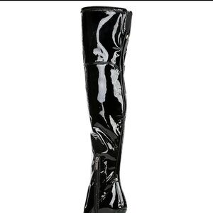 Sleek black patent leather. High stiletto heel. Over-the-knee design. Perfect for a bold look.