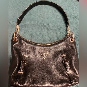 Elegant black leather bag with gold hardware. Features Guess logo emblem.