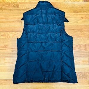 Stylish black puffer vest with silver button accents. Features zippered pockets for convenience. Perfect for layering.
