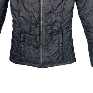 Black quilted jacket. Has hood. Preowned. Zipper pull is broken. It still zips but the pull itself is missing. See last 2 photos. Otherwise in good shape.