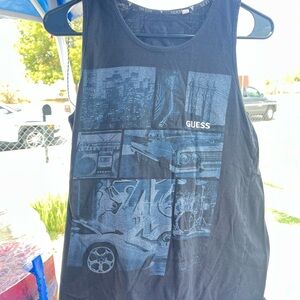 Black sleeveless top featuring urban graphic design. Includes Guess branding.