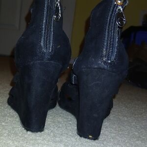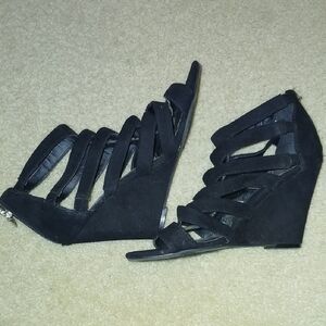 Step out in style with these chic black strappy wedge sandals. Perfect for any occasion, these shoes offer both comfort and elegance.