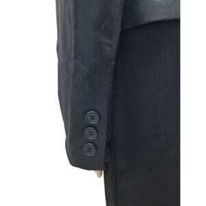 Black vintage Guess tuxedo jacket with a velvet lapel and fitted silhouette. Single breast design, and a back tuxedo tail split. One un-secured pocket over each hip. Fully lined. Three black plastic buttons on outside of each wrist.