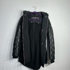 Guess Black Water Resistant Faux Fur Hood Quilted Puffer Moto Fitted Coat Size S
