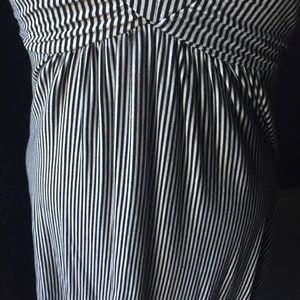 This Guess dress has thin black and white stripes. 99% Rayon, machine washable. Sexy low cut but the straps were long for me. Could easily be shortened. Rarely worn