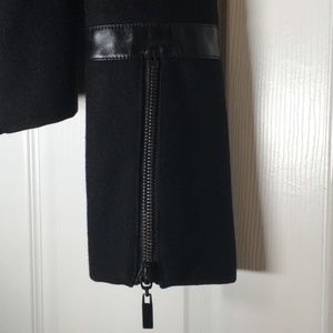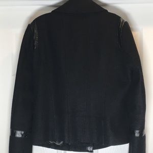 Cutting edge design, Moto-style coat jacket, featuring long sleeves with faux leather accents, and Moto-zip front closure.