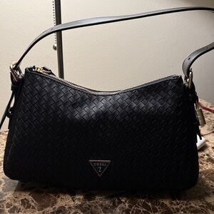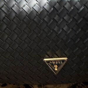 Elegant black woven bag by Guess. Accented with a gold lock detail.